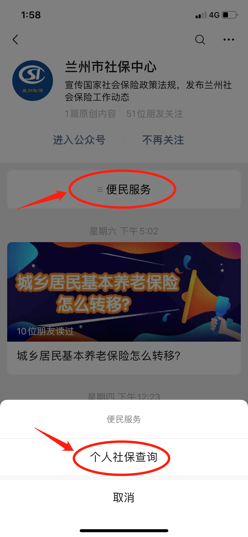 2. 进入公众号选择【便民服务】,【个人社保查询】。